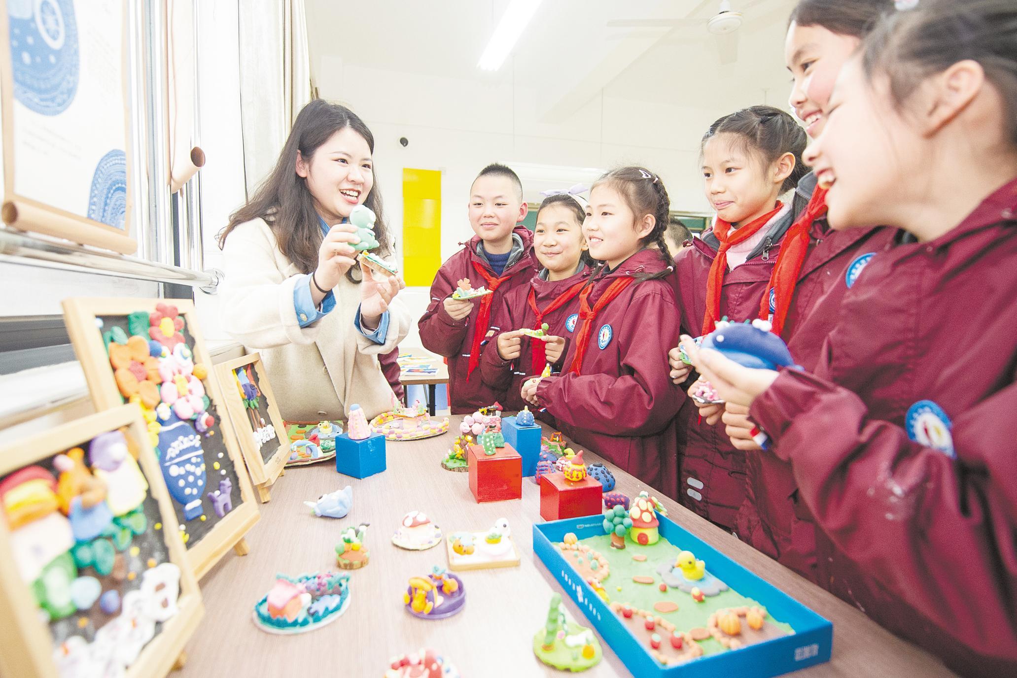 2月9日,在武汉市光谷第十二小学的校级社团课上,三年级孩子们向老师展示课上完成的黏土手工作品。