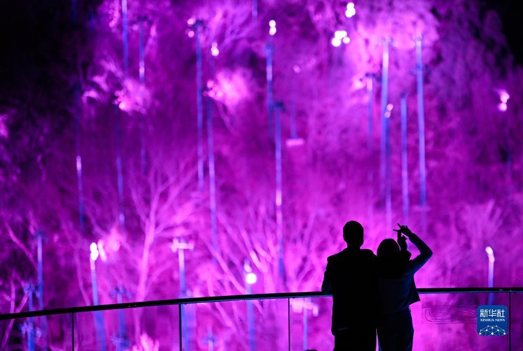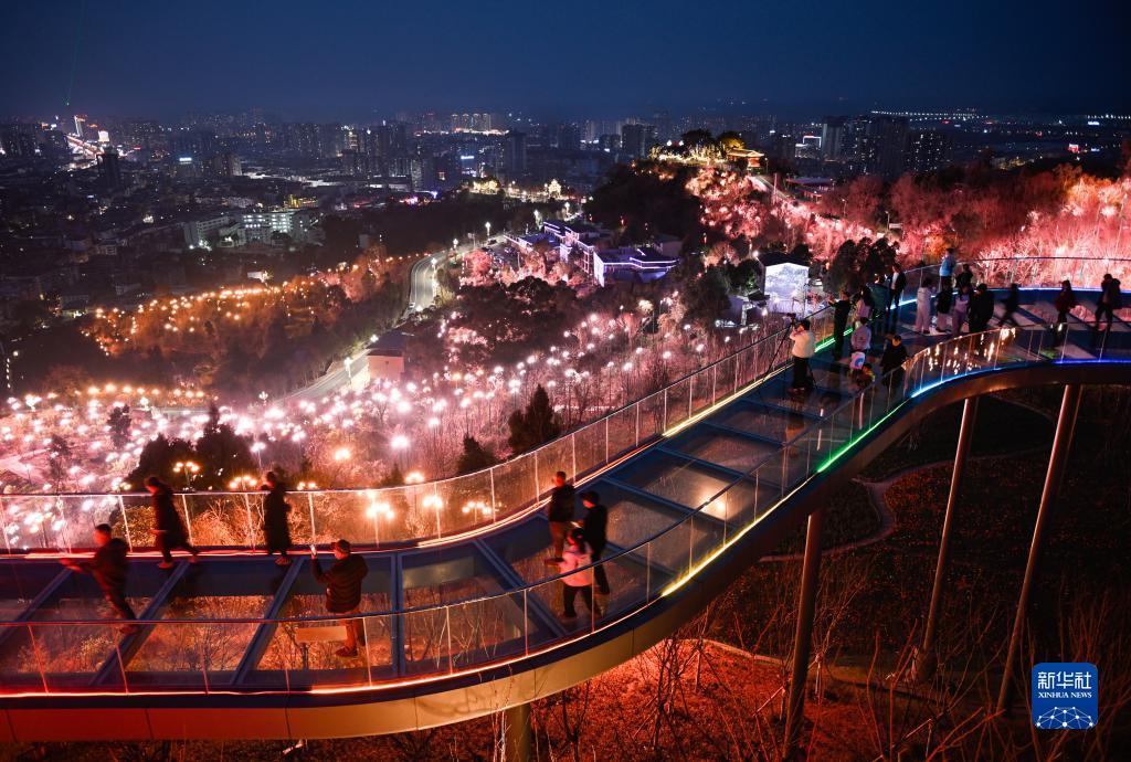 当地群众在眉山市仁寿县打造的“两山一河”亮化工程观光游览(2月25日摄)。