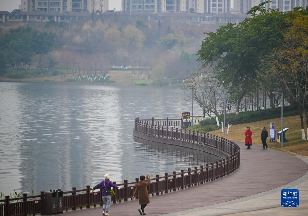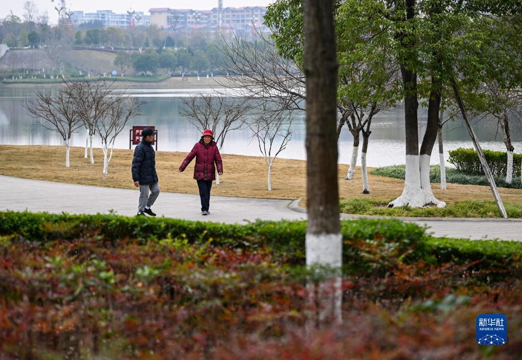 市民在眉山市仁寿县城市湿地公园散步休闲(2月26日摄)。