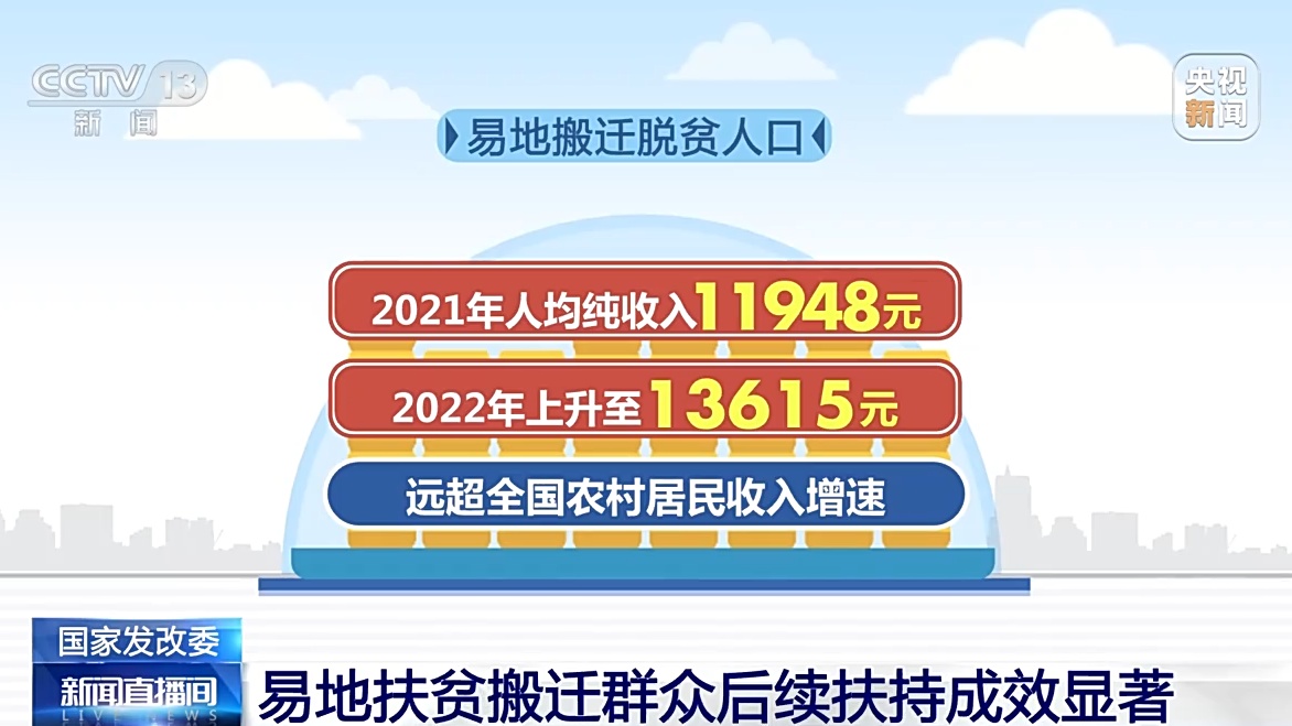 收入不断提高,实现连年较快增长。据有关部门监测数据,易地搬迁脱贫人口2021年人均纯收入11948元,2022年上升至13615元,远超全国农村居民收入增速。在收入结构中,搬迁脱贫人口工资性收入占比接近80%,高于全国脱贫人口工资性收入占比。
