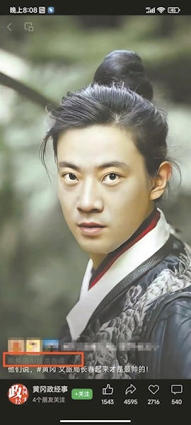 很多网友并未留意到视频下方的一行小字,“视频由AI技术合成。”极目新闻记者从黄冈市文旅局了解到,这段视频并非涂宝峰局长出镜拍摄,而是黄冈当地一名网友通过AI技术制作并发布在网上的。