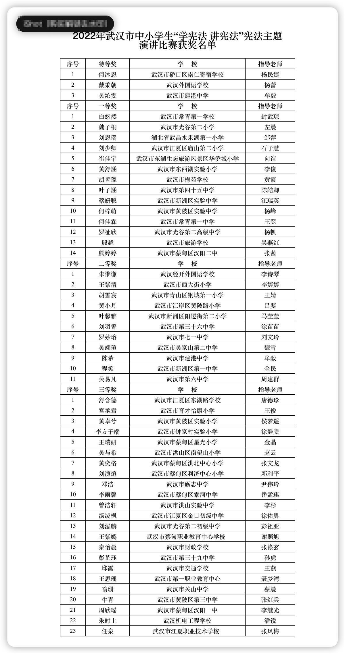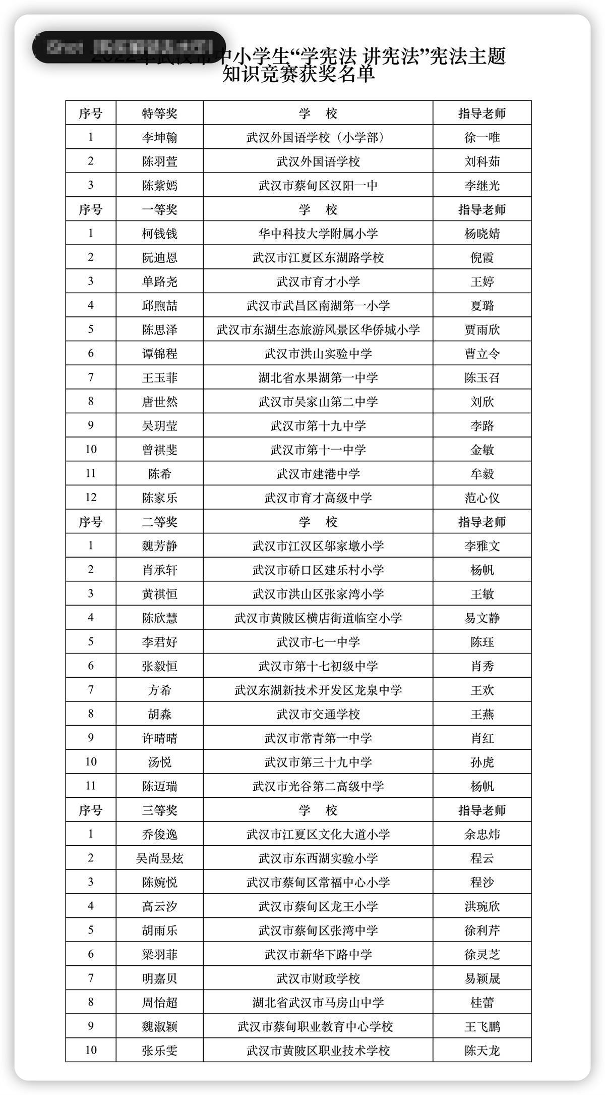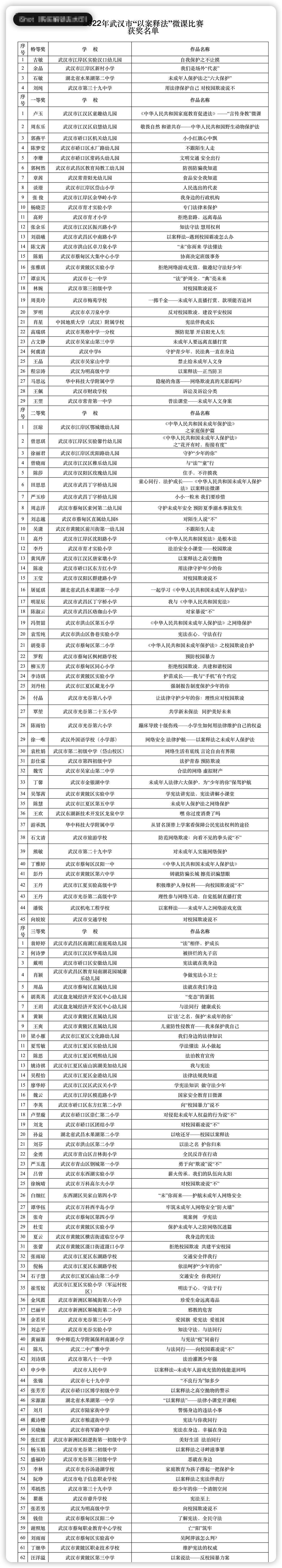 2022年武汉市中小学生“学宪法 讲宪法”宪法主题知识竞赛获奖名单