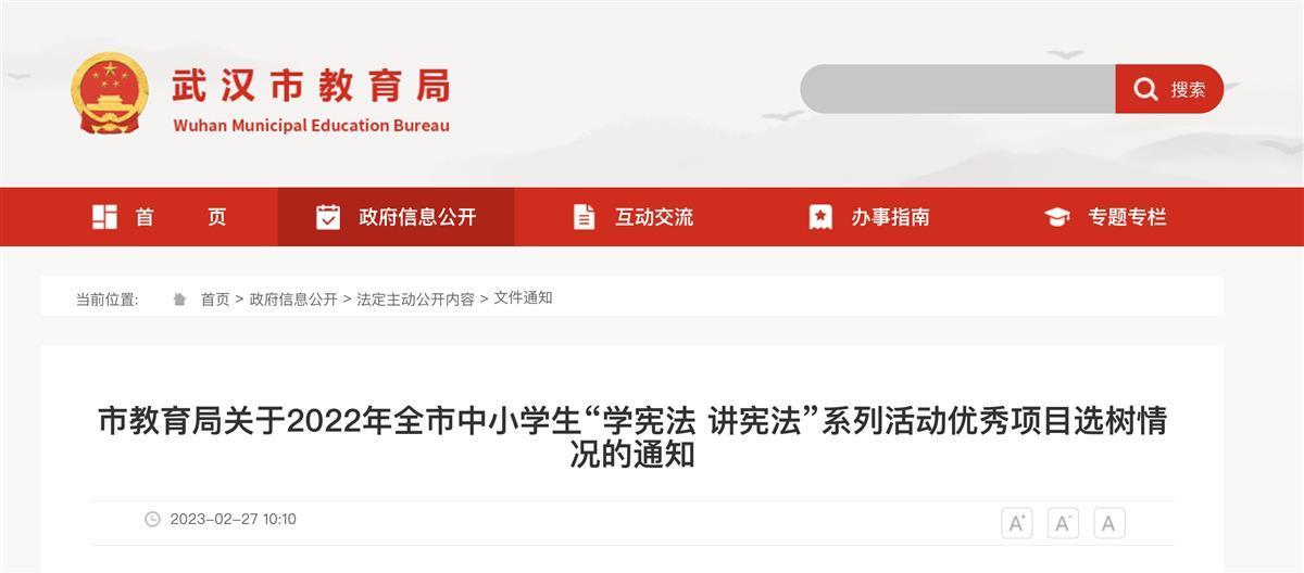 2月27日,武汉市教育局官网发布关于2022年全市中小学生“学宪法 讲宪法”系列活动优秀项目选树情况的通知,公布了武汉市中小学生“学宪法 讲宪法”活动优秀组织单位名单、2022年武汉市中小学生“学宪法 讲宪法”宪法主题演讲比赛获奖名单、2022年武汉市中小学生“学宪法 讲宪法”法治知识竞赛获奖名单以及2022年武汉市“以案释法”微课比赛获奖名单。