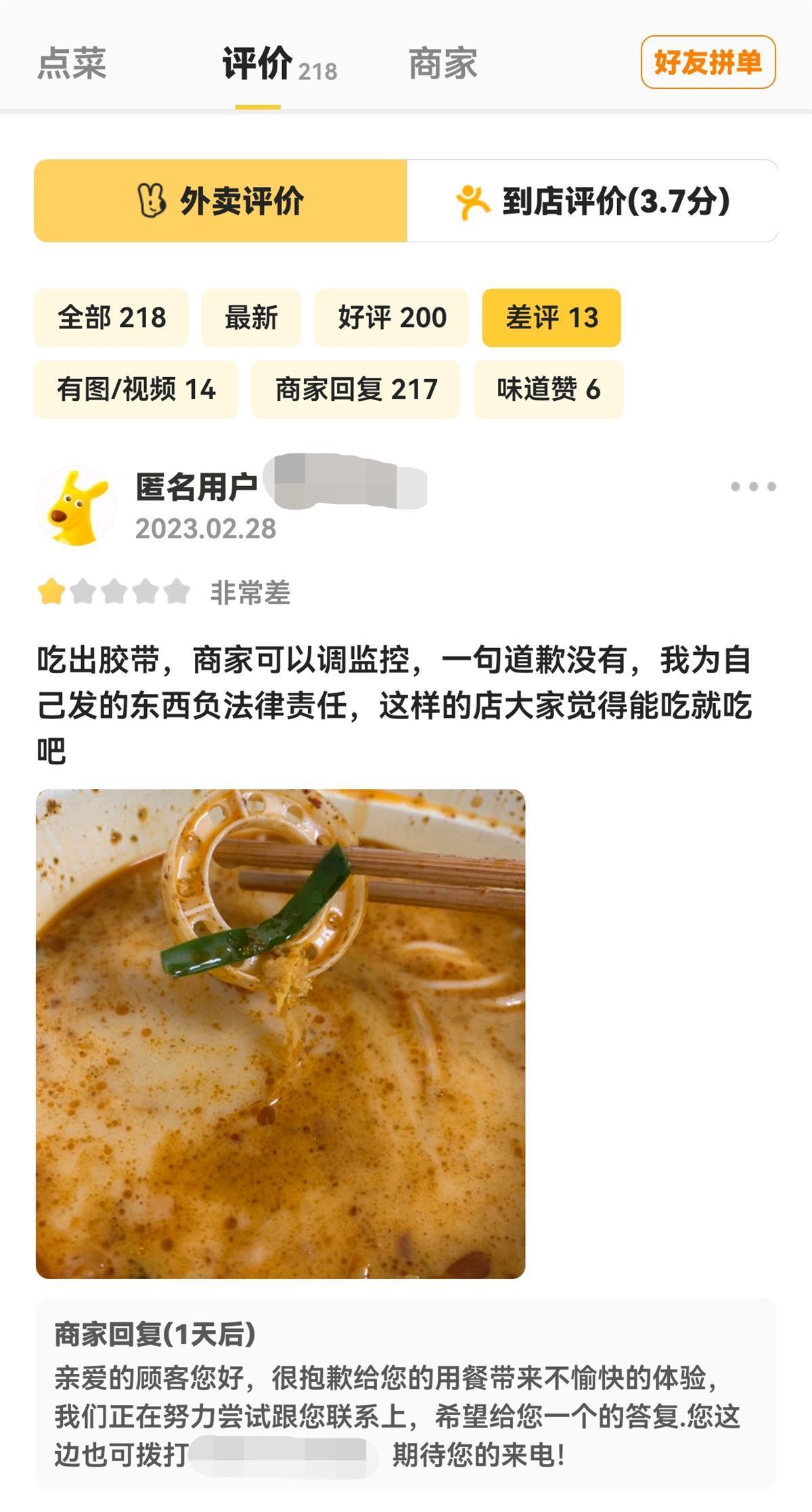 刘先生提供的对话及订单截图显示,2月28日中午,他花30元点了一份川香麻辣米线外卖。12时30分许,他将吃出胶带卷的照片在线发给了店家,系统显示店家已读但没有回应。