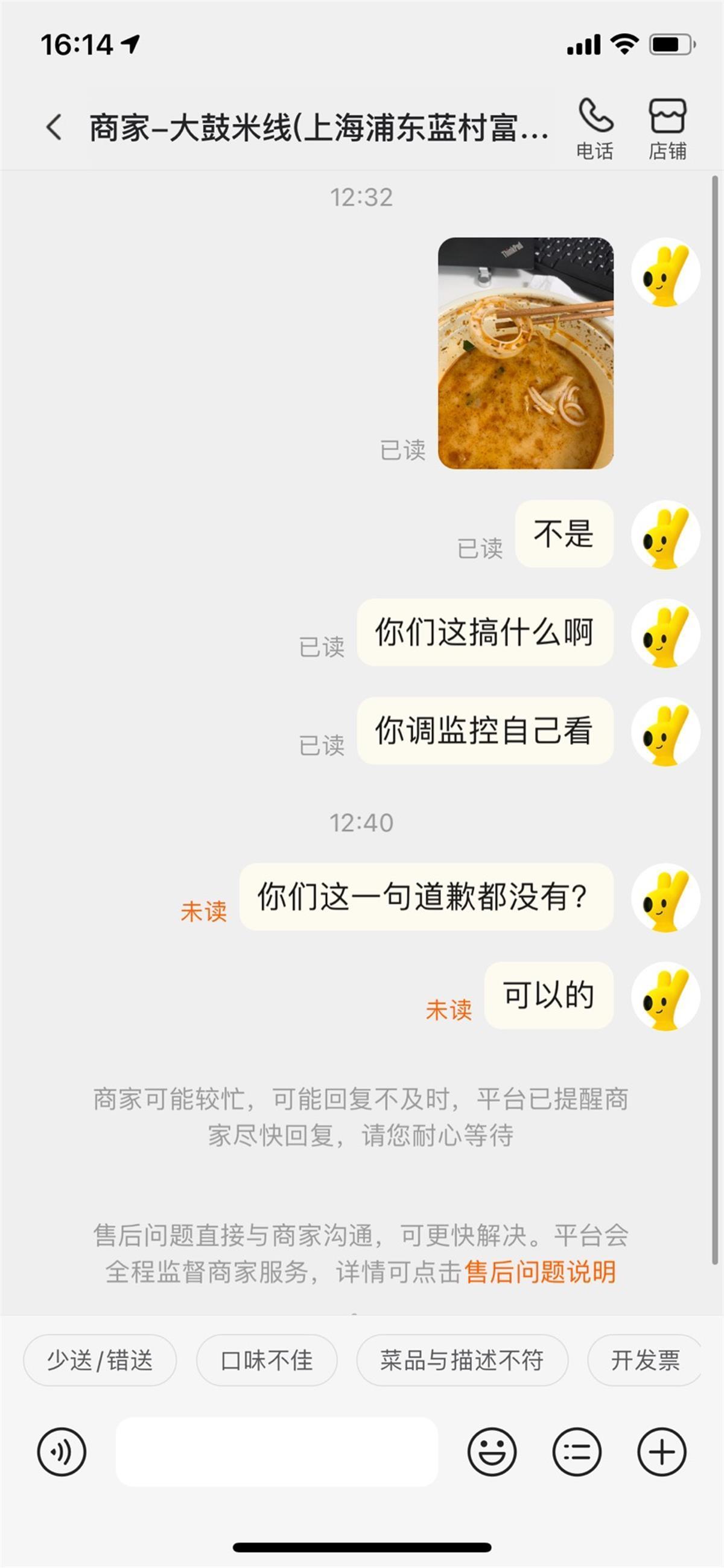 “他们说让我直接找外卖客服,然后给他们发截图。”刘先生说,他找外卖平台反映了此事,也继续在线询问了店家,但店家读过消息后没有回复,平台客服则建议他直接申请理赔。