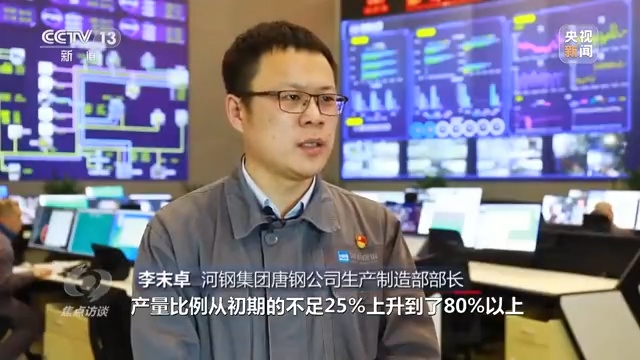 河钢集团唐钢公司生产制造部部长 李末卓:我们企业科技含量高的品种钢,产量比例从初期的不足25%上升到了80%以上,高端产品占比也提高到了60%以上。通过转型升级,实现了产品质量和产业链现代化的双提升,以及产业技术革新,为企业绿色、低碳、可持续的高质量发展奠定了坚实基础。