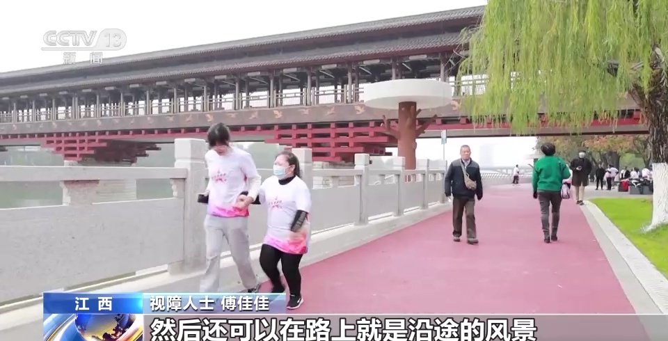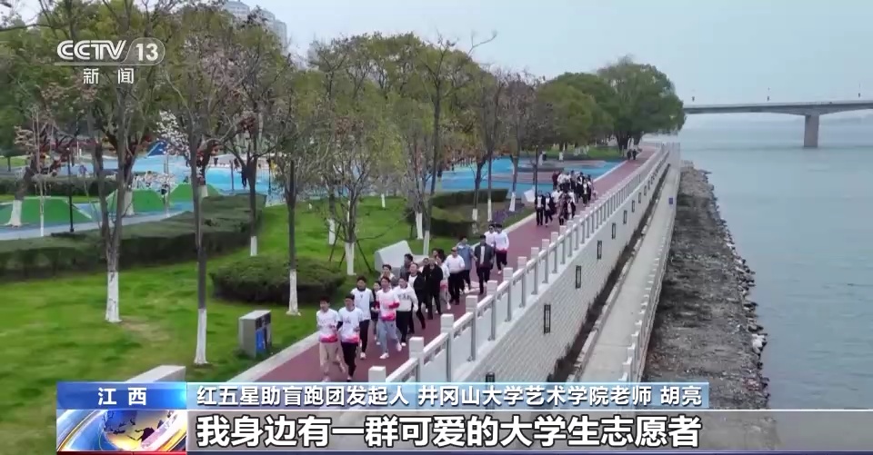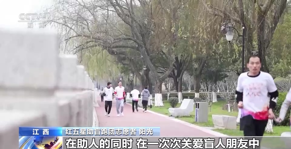 在江西吉安市滨江公园,每到周末,红五星助盲跑团的志愿者们就会带着视障朋友来到这里,开启晨跑运动。