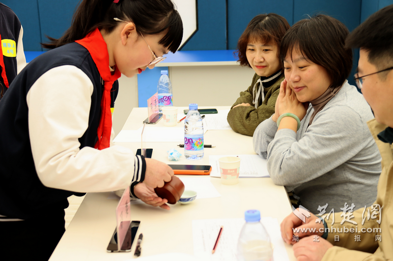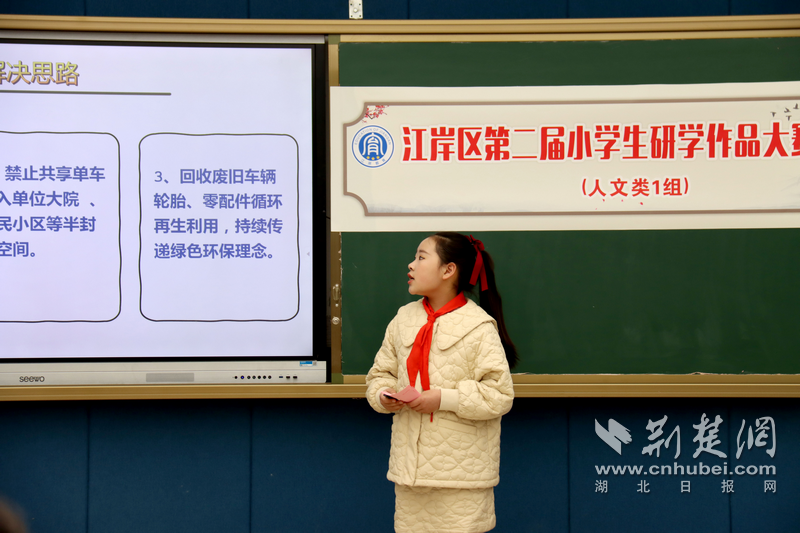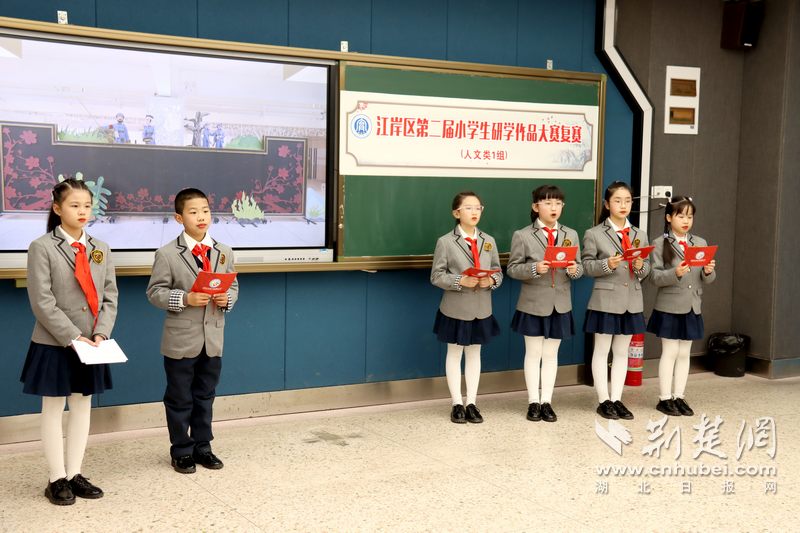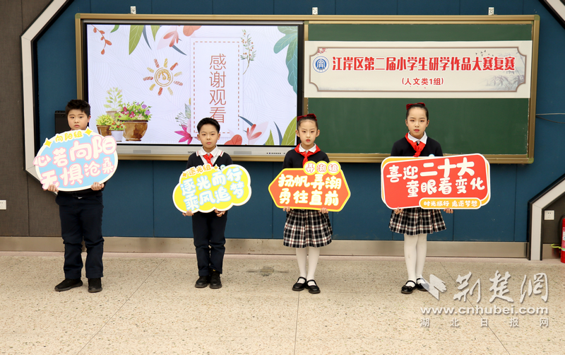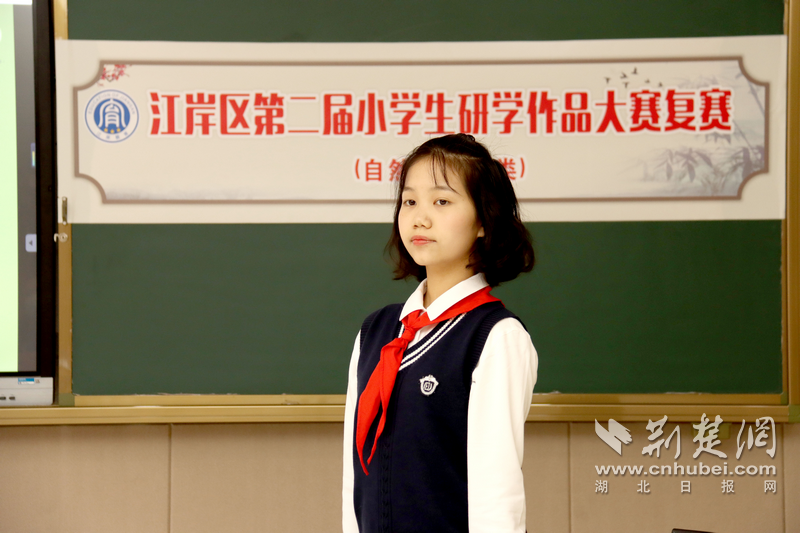 怀着期待又激动的心情,小选手们走进精心布置的赛点教室,迎接两轮展示。首先是作品介绍,选手结合多媒体课件,现场分享选题的产生、研究目标、研究过程、研究结论、研究收获等。其次是评委提问,评委根据选手的介绍提出一个与作品有关的问题,选手现场作答。同学们展示的研学作品包罗万象,知识面之广、挖掘点之深令人惊叹,有“稻田研学——研荆楚稻香品家乡美食”“读自己的城市——关于武汉道路的命名”“‘码’上幸福之二维码带来美好生活”“下雨,水到哪里去了?”……他们自信大方的仪态,默契密切的合作,机智精妙的回答,让评委老师们称赞不止。