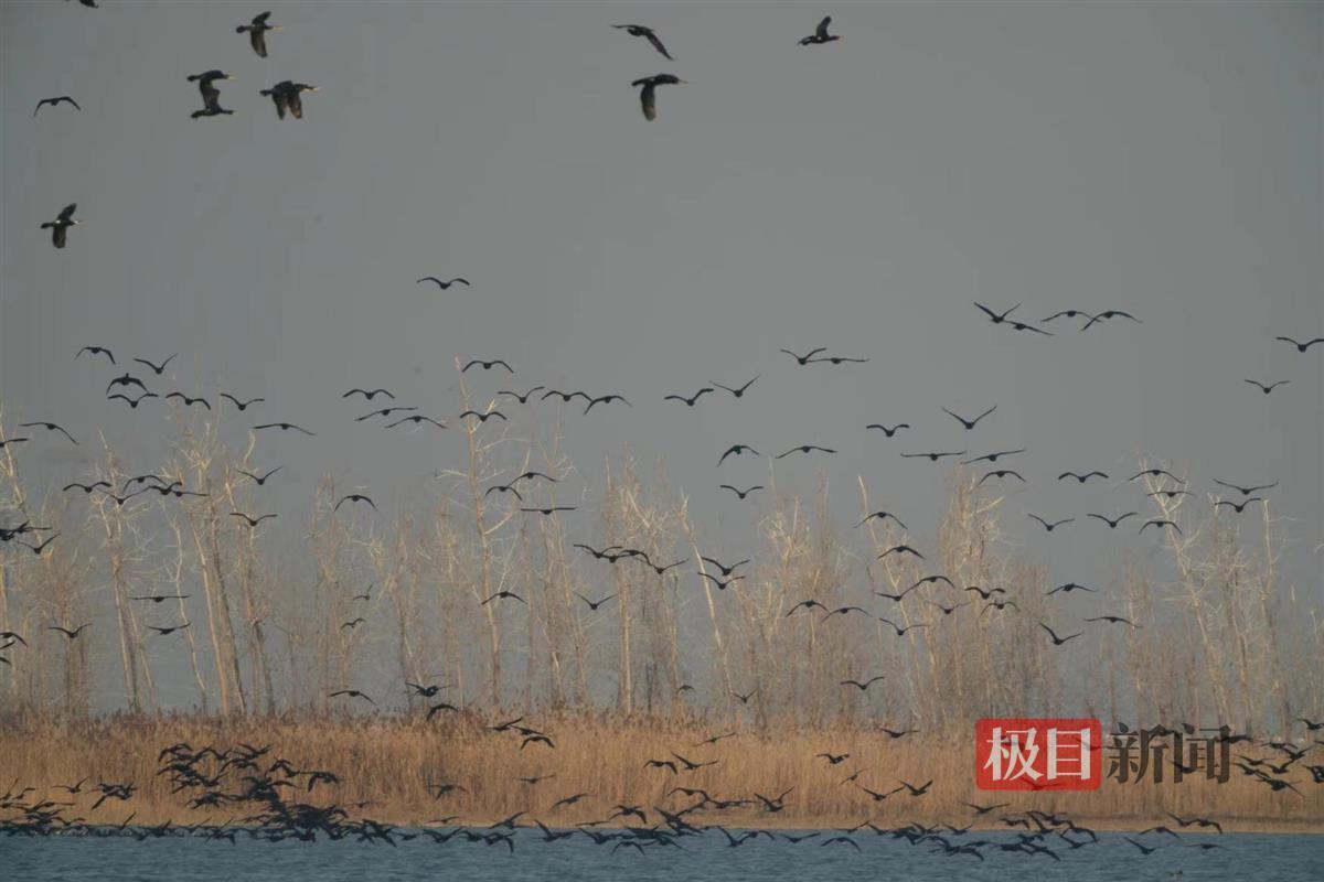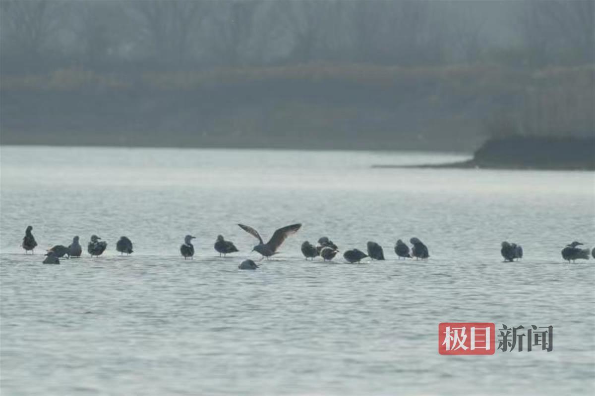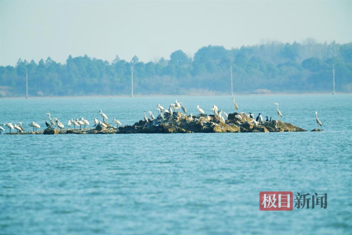 在湖北鄂州梁子岛附近湖面上可以看到,大群白琵鹭、鸬鹚、红嘴鸥在这里聚集,时而在水面嬉戏、觅食,时而在空中翱翔,与周围的自然景观构成一幅和谐的画面。