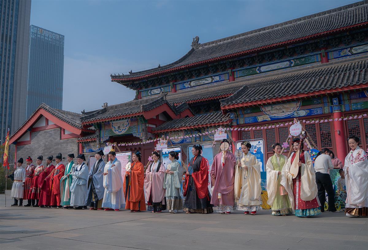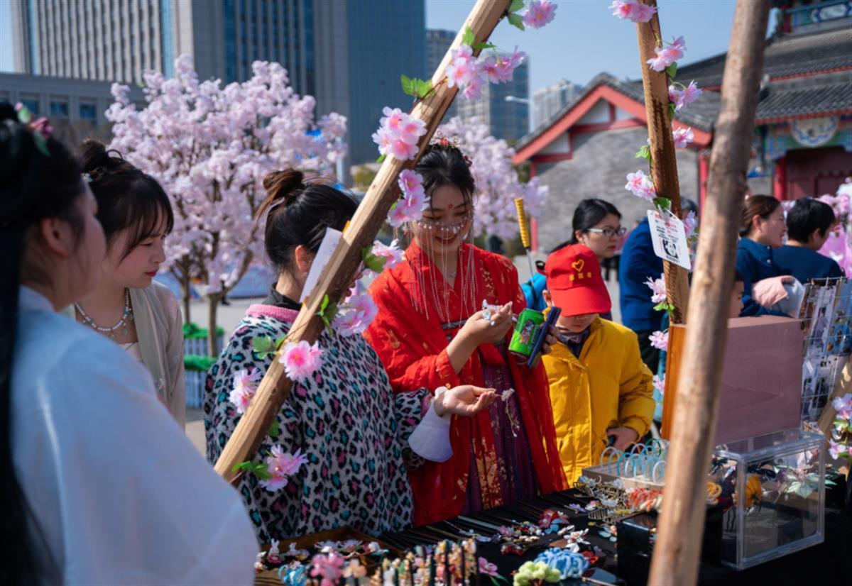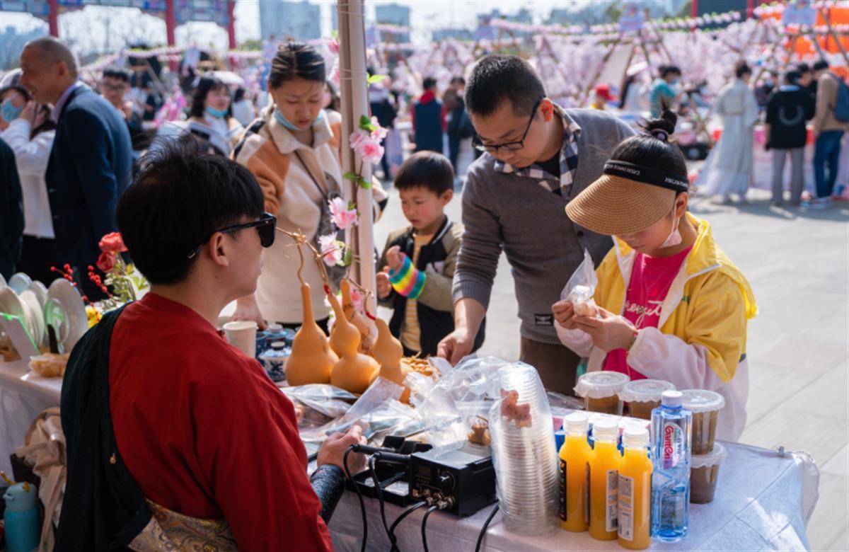 活动现场,不仅有琳琅满目的非遗文创市集、后备箱市集、巾帼农庄市集可逛,还有传统工艺、香飘四溢的美食小吃可品;既有传统雅趣的投壶体验、非遗研学体验,轻松欢乐的联谊活动和月老办事处等可玩,又有华美典雅的汉服巡游、翩然若仙的花神表演、好戏连台的戏曲表演、“看见她的美好”春天朗诵音乐会等精彩活动可赏。活动现场,如梦如幻的樱花连廊、灯笼阵吸引了不少游客拍照留念,一些年轻游客还特意穿上传统汉服来此打卡。