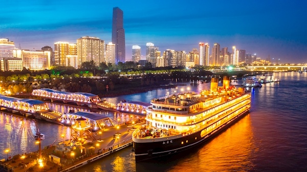 “知音号”这个周末也是场场爆满,夜间单场接待游客超600人,为此,周六特增开双场演出,比往年的双场开放时间提早一个月有余。夜幕降临时,“知音号”与两江四岸的灯光如期亮起,一声汽笛鸣响,身着旗袍长衫的演员们相继登场,迅速将大家带入上个世纪活色生香的老武汉,沉醉在一场新奇的视听盛宴中。