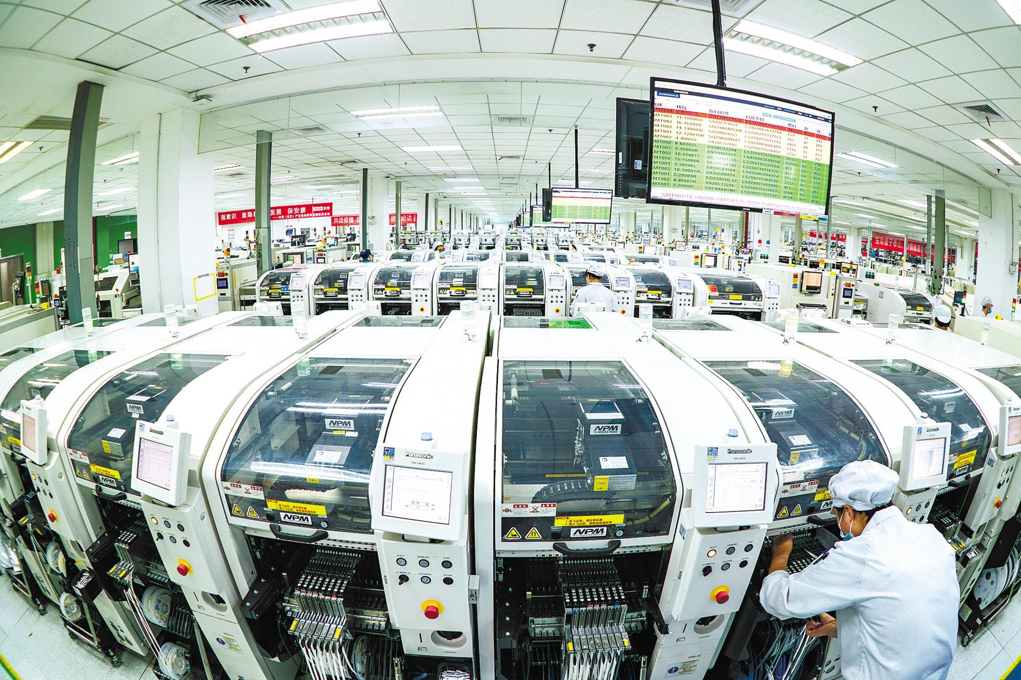 联想武汉工厂洁净厂房内,所有产线全开,加速生产智能手机、平板电脑等出口订单。(湖北日报全媒记者 魏铼 摄)