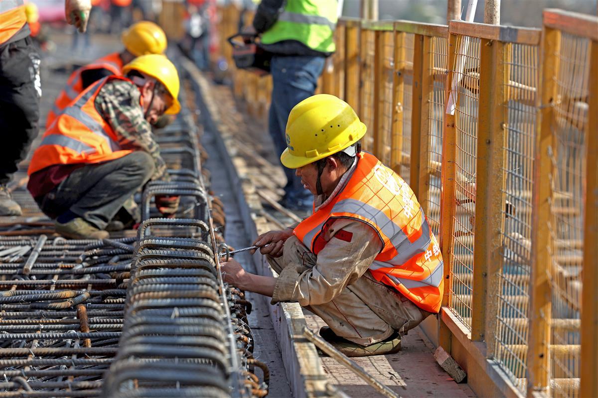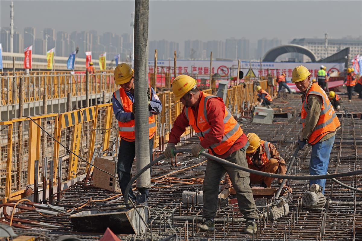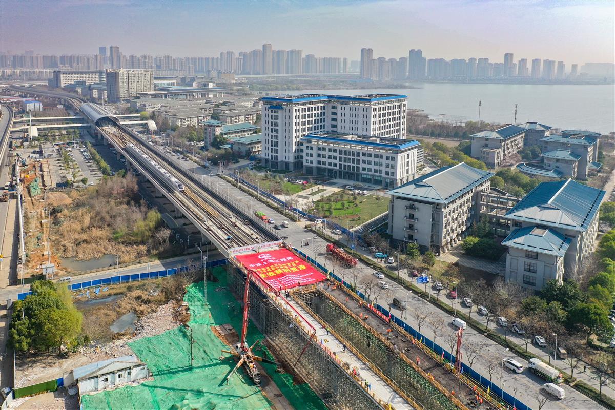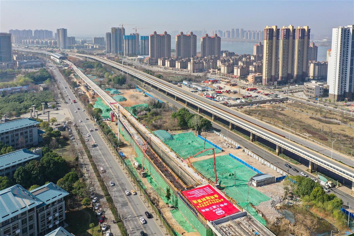 3月6日,空中航拍当日武汉轨道交通5号线起点调整工程。当日,武汉轨道交通5号线起点调整工程桥梁全线贯通,目前轨道铺设双线仅剩下最后1600米,即将全线轨通。据介绍,武汉地铁5号线起点调整工程位于白沙洲大道与黄家湖西路之间,起于红霞村站,经科技大学站与5号线起点中医药大学站相接。线路长约2.61公里,共设2站2区间,沿线周边有湖北中医药大学、武汉工商学院、武汉科技大学、武汉交通职业学院等高校,在校师生超10万人,为师生出行提供了极大便利。(湖北日报全媒记者 倪娜 通讯员 曾斯 袁永华 摄)