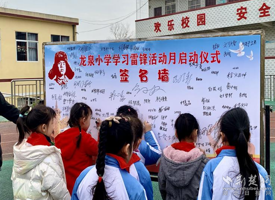 3月3日上午,龙泉小学举行了“学雷锋、讲文明、树新风”的“学雷锋”仪式。同学们在签名墙上纷纷郑重地签下了自己的姓名。(顾德福)