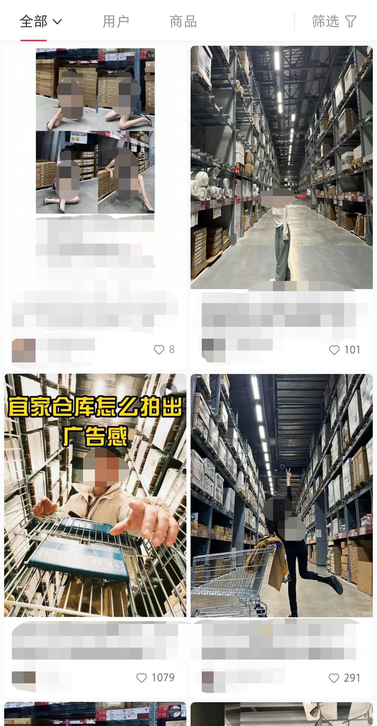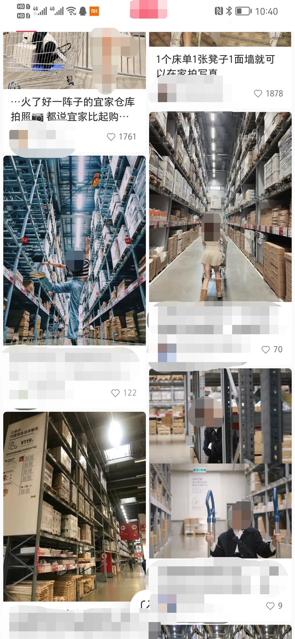 逛过宜家的朋友都知道,宜家仓库场地开阔,人少,货架以及货物排列都非常整齐,满满的工业风,非常适合拍照,出片率很高。因此,一些小姐姐趋之若鹜。在很多社交平台,稍加搜索,即可看到“宜家仓库怎么拍出广告感”“宜家全位置打卡拍照攻略”“九个万能的宜家拍照POSE”等话题,颇受关注。