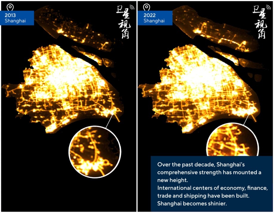 第三组卫星对比图显示了2013年、2022年上海市的夜景。过去十年是上海自贸试验区由诞生到发展的十年。截至2022年10月,浦东吸引外资在上海市占比超过40%,跨国公司地区总部占比近50%,外贸总量占比约60%。