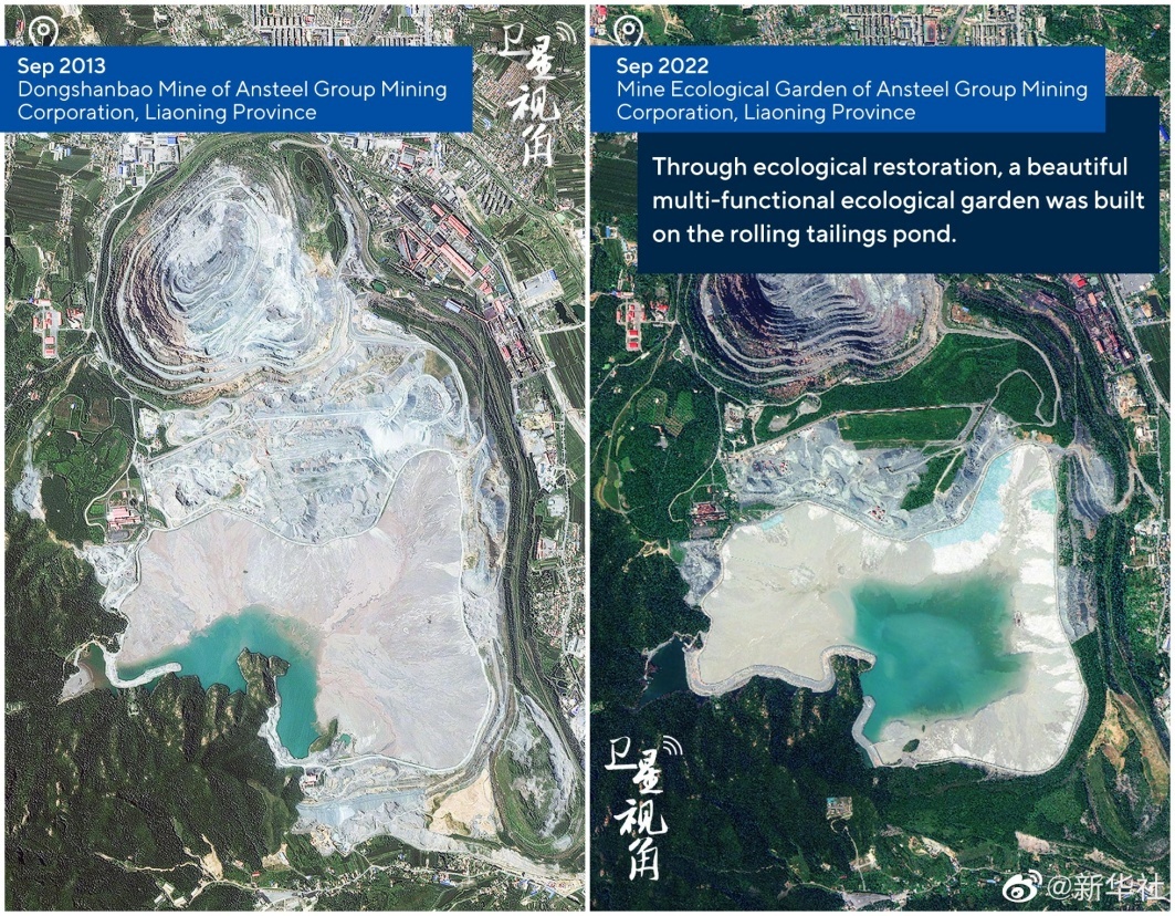第五组卫星对比图显示了2013年9月的辽宁鞍钢矿业东山包、2022年9月的辽宁鞍钢矿山生态园。