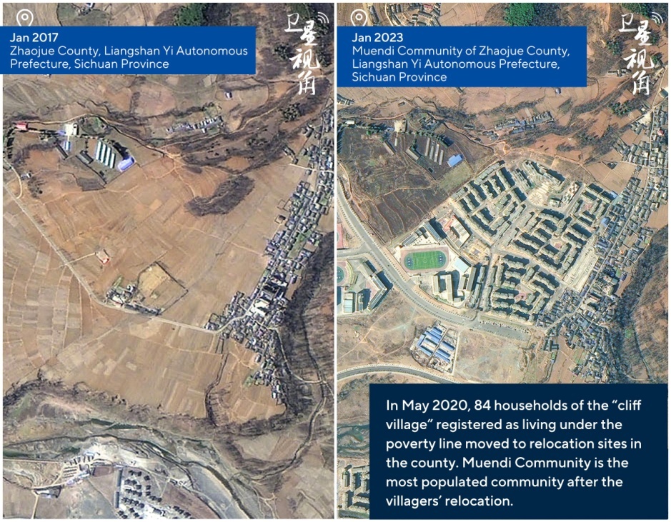 随后,华春莹陆续发布了4组卫星对比图。第二组卫星对比图显示了2017年1月四川省凉山州昭觉县“悬崖村”和该村2023年1月搬迁后的样貌。2020年5月,“悬崖村”84户建档立卡贫困户陆续搬迁到县城安置点。沐恩邸社区是村民搬迁后聚居最多的社区。