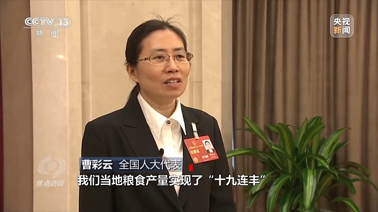 全国人大代表 曹彩云:我们当地粮食产量实现了“十九连丰”,靠的是发展绿色生态农业和农业生产关键核心技术攻关。将来也要继续加强技术攻关,加强农业综合生产能力的提升,推动农业高质量发展,才能把饭碗牢牢端在自己的手里。
