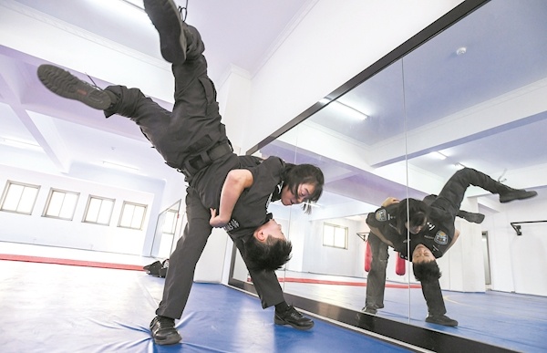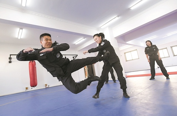 一旁,一队女子特警队员正在操练匕首格斗术。女子特警大队大队长陈蔚也来到现场,指点技术要领。