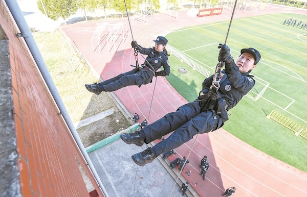 高空索降,破窗,擒拿格斗,女子特警队员们像男队员一样,每天的训练日程排得满满当当。她们清晨6时30分出操,负重40公斤的沙衣、绑腿越野跑5000米,以每分钟不少于100次猛击拳击,引体向上、俯卧撑、水泥桩等力量训练,搏击、射击、战术、攀登等警事技能训练。