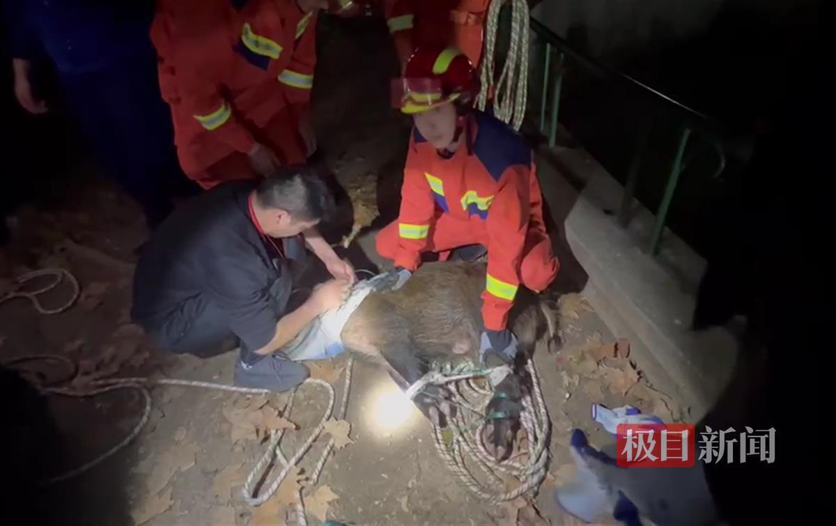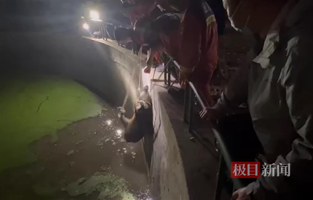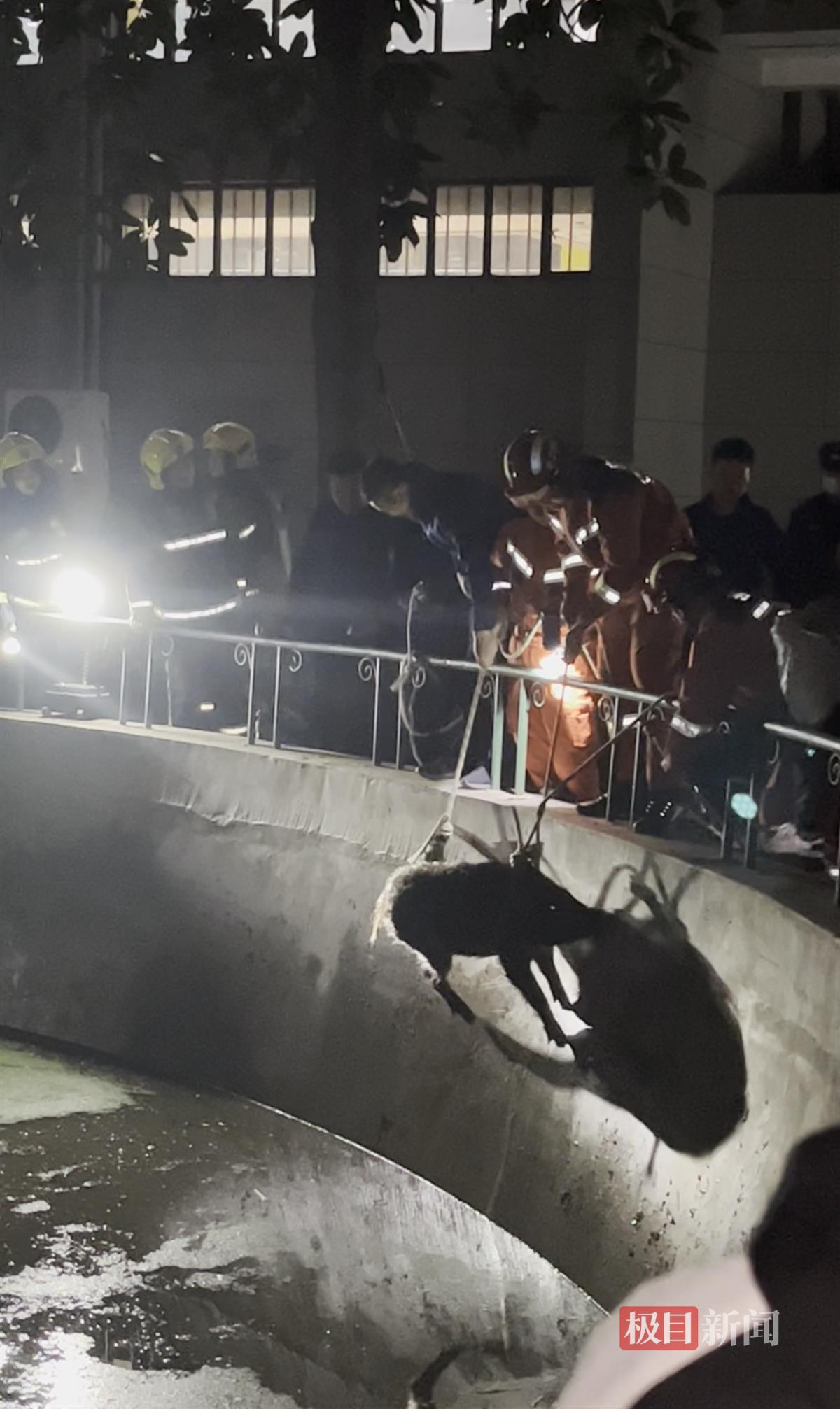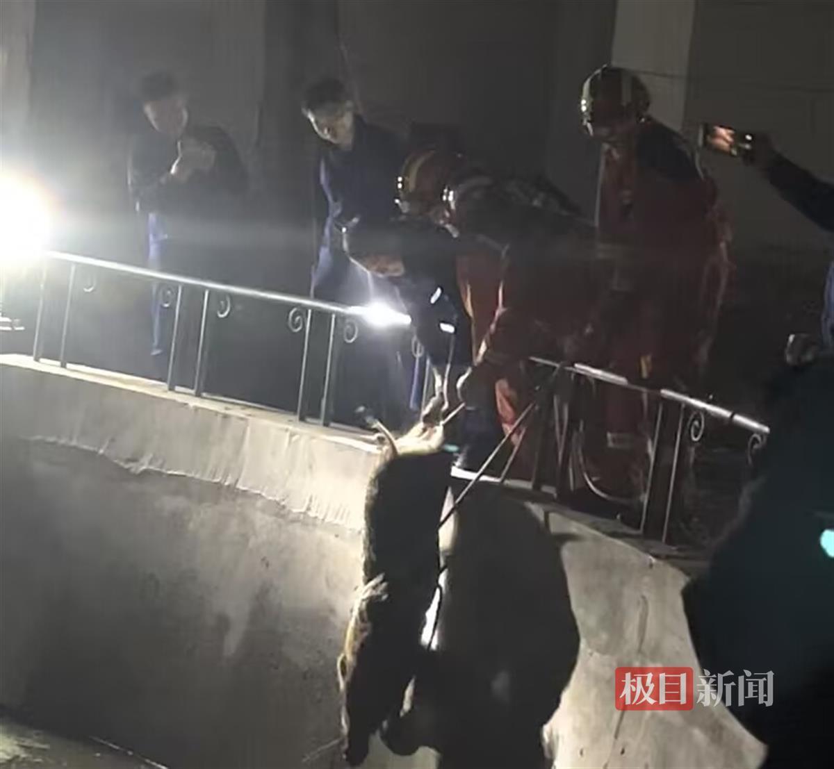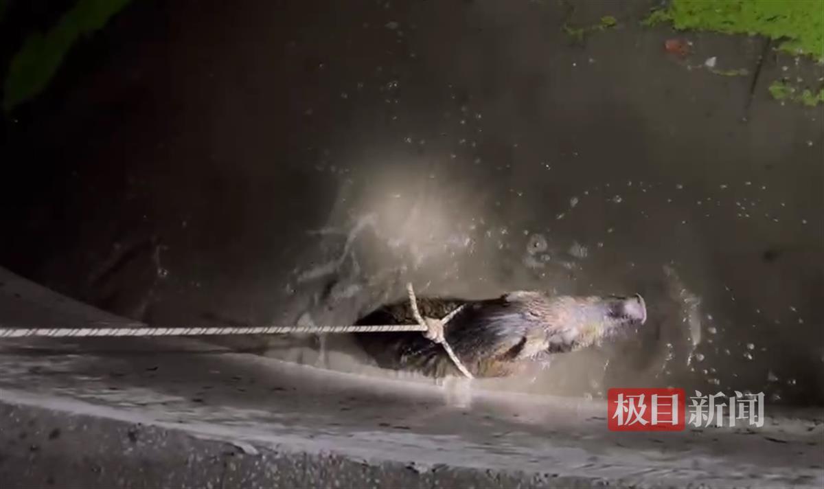 在观察现场情况后,消防员决定利用绳索、抓捕器等工具对野猪进行捆绑固定,然后再将它拉起来。考虑到野猪攻击性强,为避免伤及群众,在将野猪拉至水池护栏附近时,消防员使用绳索对野猪嘴部进行了捆绑固定。最终,在众人协同配合下,成功将野猪拉起至地面,并转交给林业部门处理。