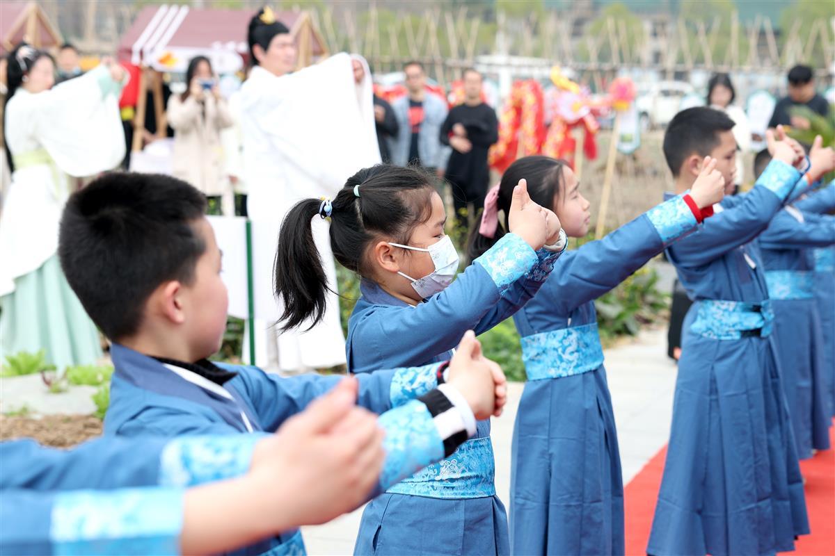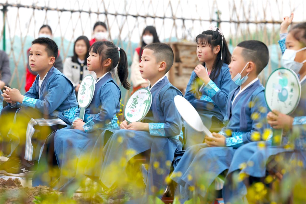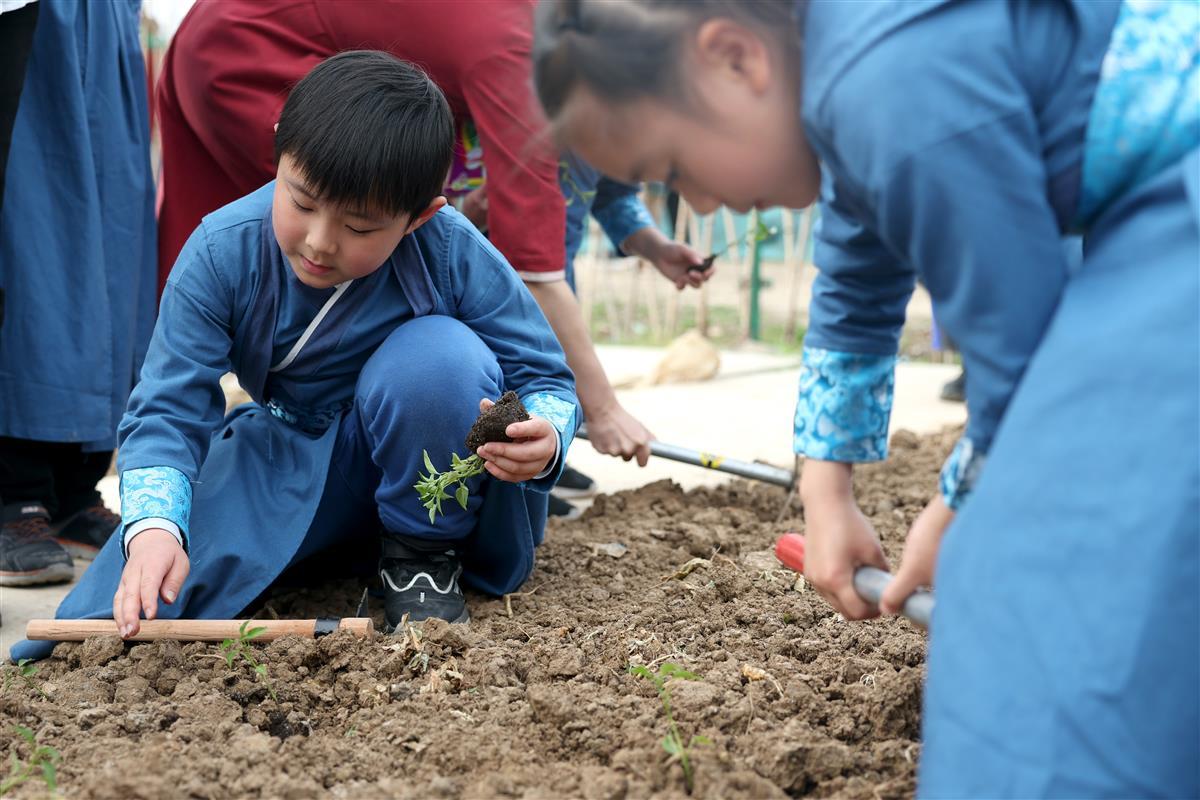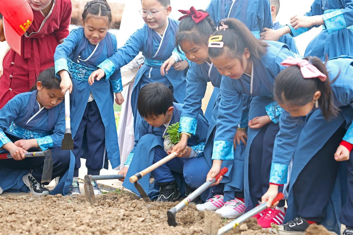 3月9日,小朋友们在农田公园内体验农事。武汉市东西湖区将军路街熊家墩社区联合武汉客厅九典书房,在农田主题公园乃粒园内开展“天地启春色,万物共‘耕’新”活动。小朋友身着传统服饰,在志愿者老师们的带领下学习传统农耕文化,在田间舞龙闹春,同时还自己动手实践,拿起锄头在田地里播种玉米、辣椒、芋头等农作物。此举旨在进一步弘扬尊重劳动、崇尚劳动的中华民族优良传统。(湖北日报全媒记者倪娜 通讯员刘瑞琦 安洁 摄)