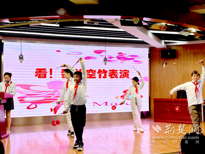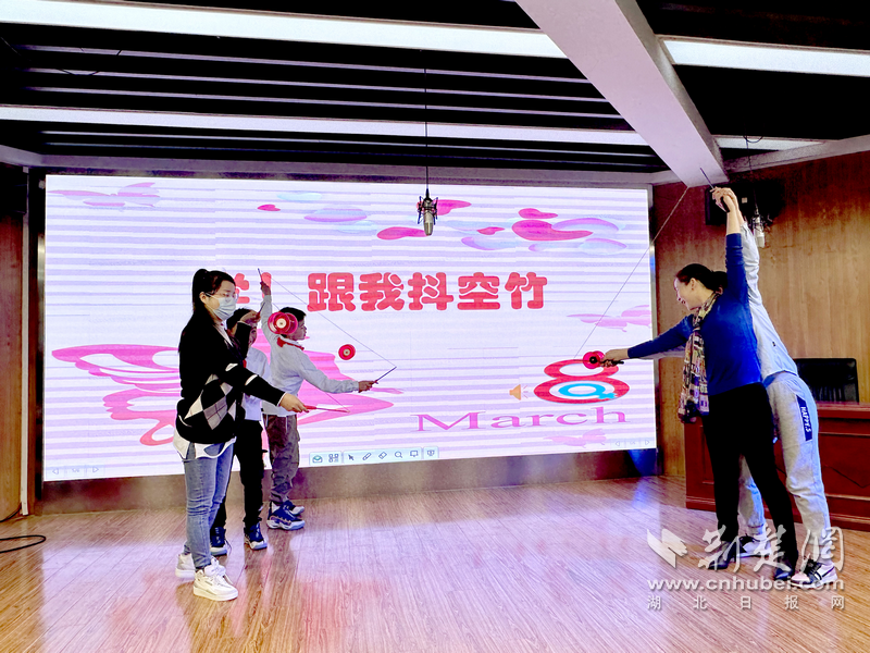 荆楚网(湖北日报网)讯(记者齐一璇、许文秀)“猴子捞月”“仙人过桥”“腰缠玉带”“定海神针”……春水初生,春林初盛。长在春天里的孩子们,一不小心就秀了一把非遗“绝活”。在3月8日国际妇女节之际,武汉市江汉区惠康里小学把妈妈们请进学校,以学校特色项目——“空竹”拉动亲子关系,献上一份有意义的节日礼物。