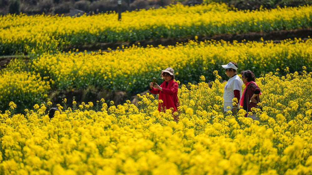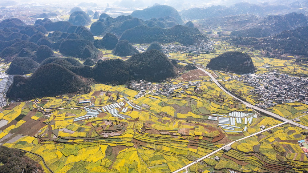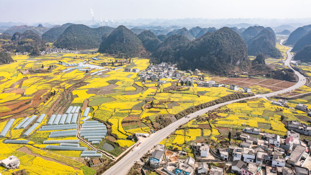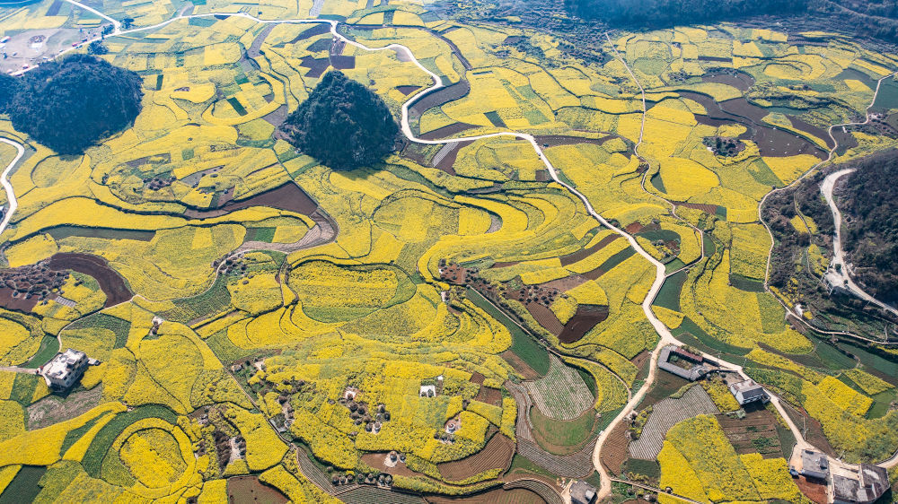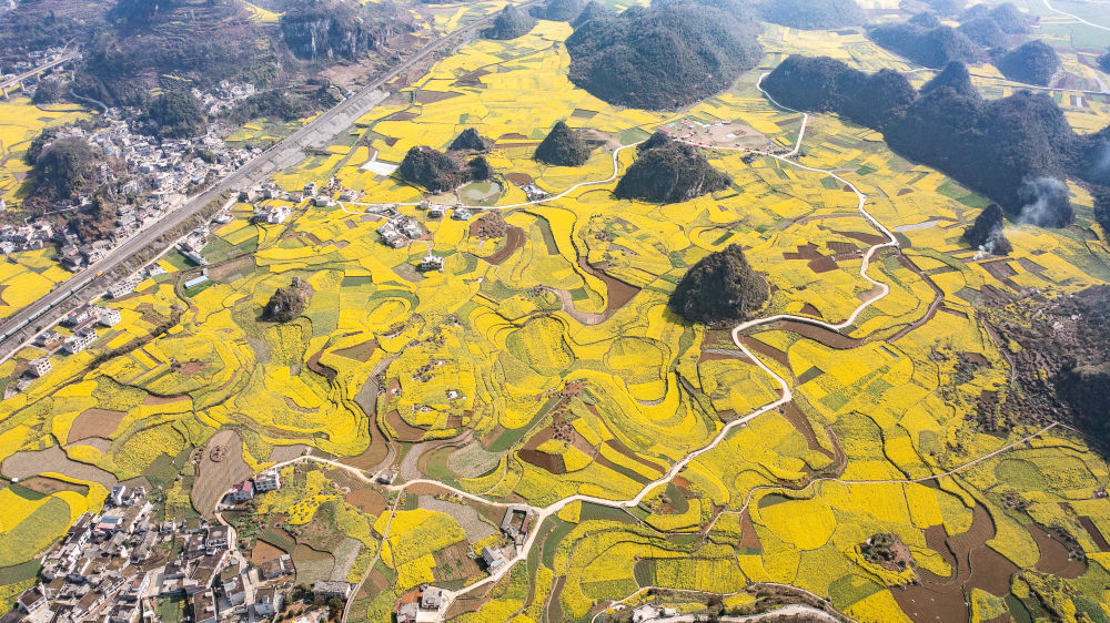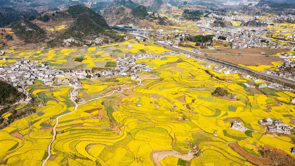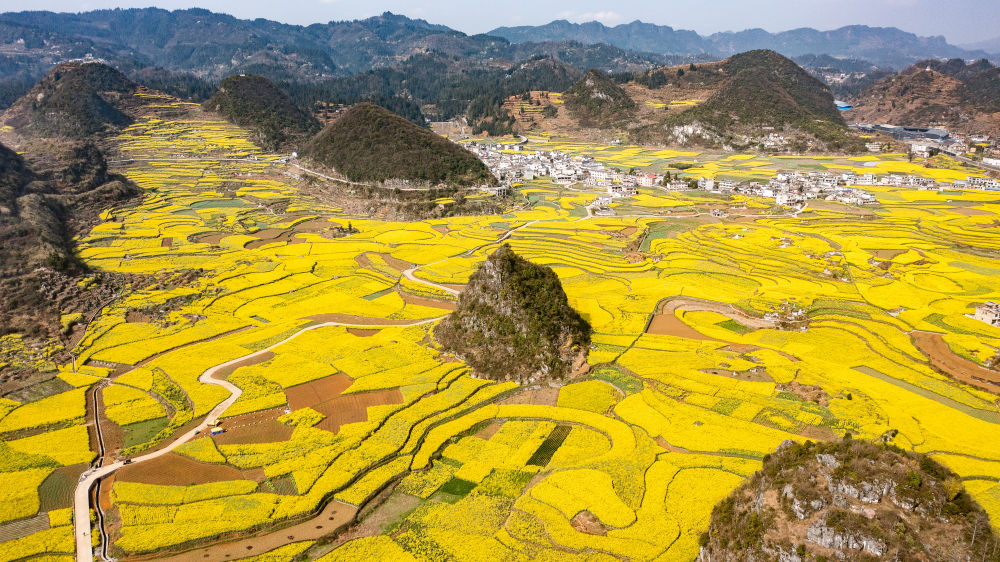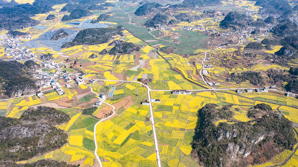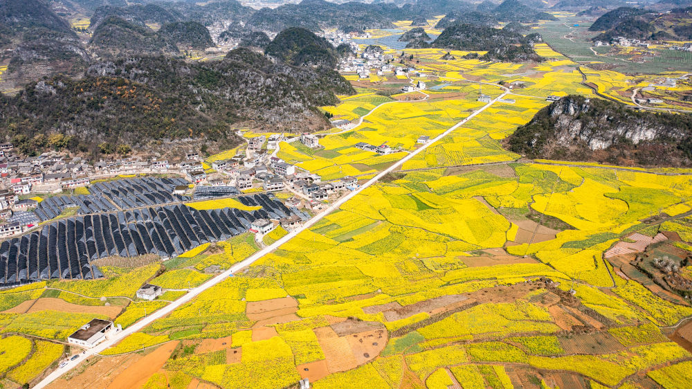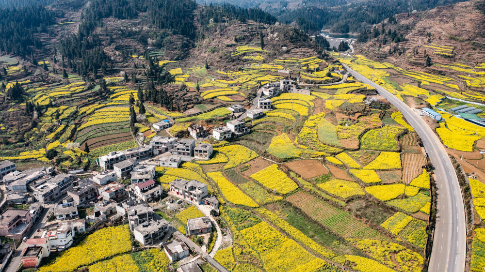 近日,贵州省六盘水市六枝特区木岗镇的16000余亩油菜花竞相绽放,与田地、民居、道路构成了美丽的春日画卷。