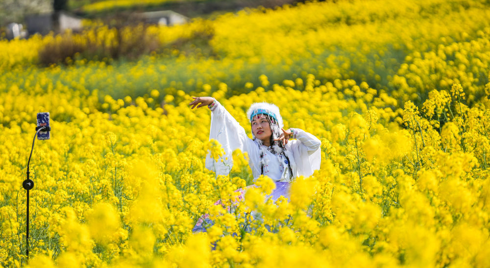 ↑3月9日,游客在贵州省六盘水市六枝特区木岗镇瓦窑村的油菜花田里直播舞蹈表演。