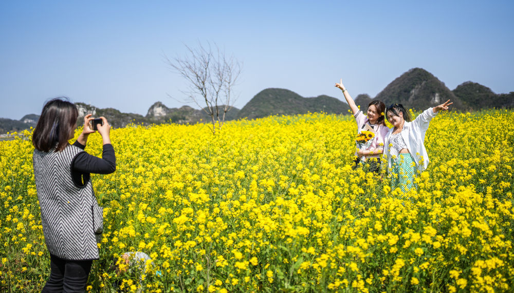 ↑3月9日,游客在贵州省六盘水市六枝特区木岗镇瓦窑村的油菜花田里拍照游玩。