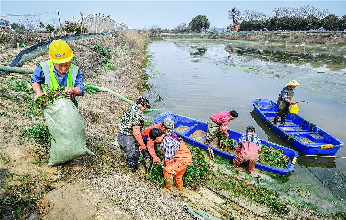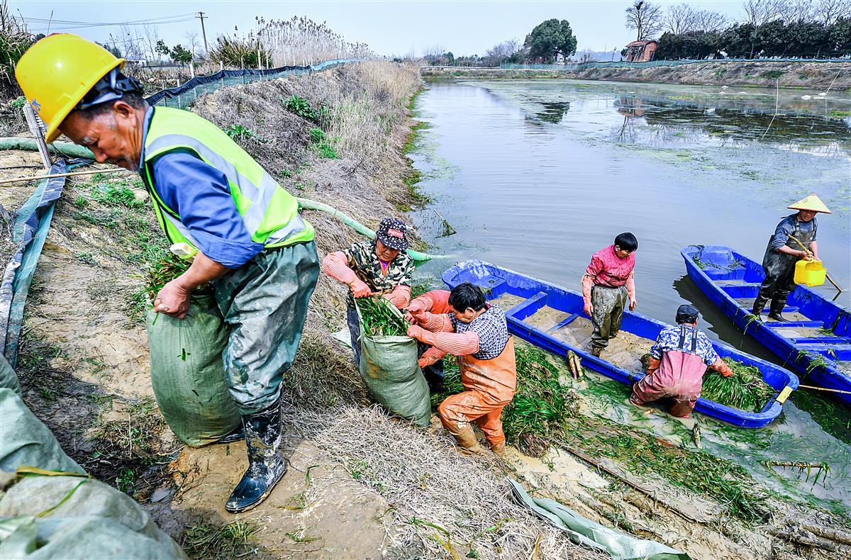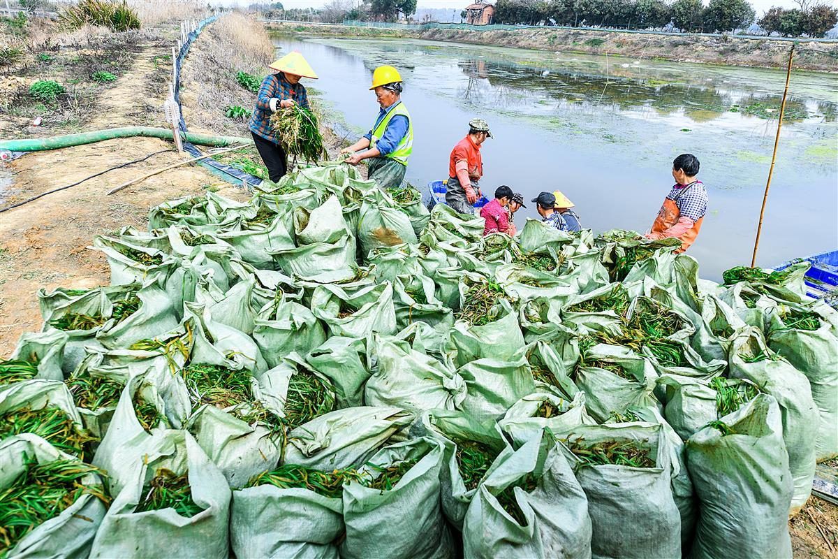 3月11日,位于武汉市江夏区湖泗街某生态科技有限公司基地,工人们正在池塘中打捞沉水植物苦草,苦草被装入编织袋里,运去武汉城区和鄂州用于湖泊的水生态修复工程。