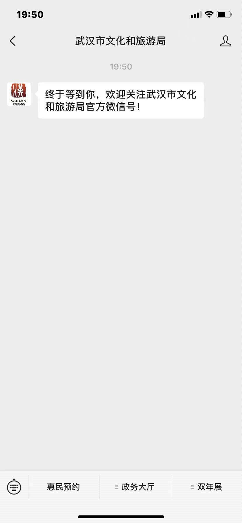 关注“武汉市文化和旅游局”官方微信公众号(账号:wuhanwenlv),进入公众号主页,点击左下方菜单栏【惠民预约】进行预约。