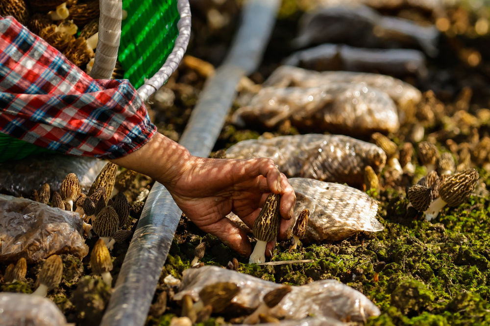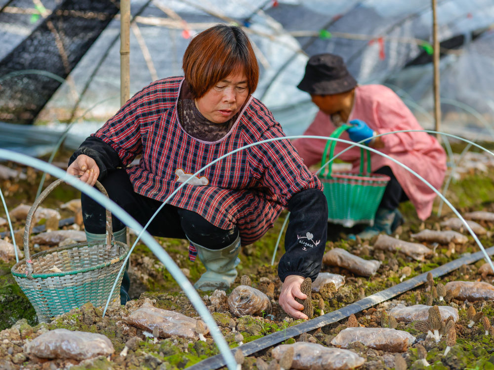 3月8日,成都市大邑县新场镇灯笼社区的村民在大棚里采摘羊肚菌。新华社记者 沈伯韩 摄