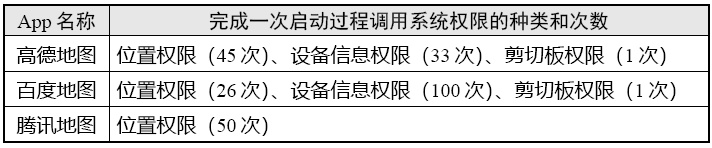 (1)在启动App场景中,调用系统权限种类最多的为高德地图和百度地图(均为3类),调用系统权限次数最多的为百度地图(127次)。具体情况如表2。