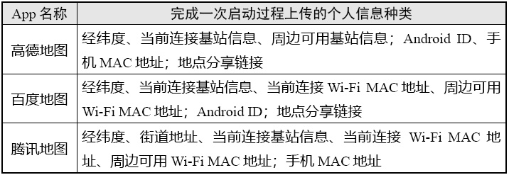 (1)在启动App场景中,个人信息上传种类最多的为高德地图和百度地图(均为3类)。具体情况如表6。