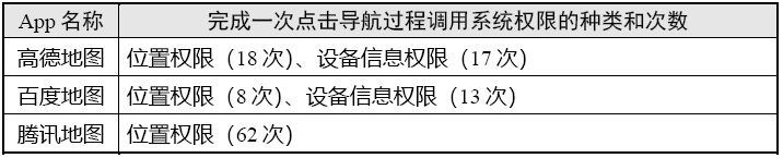 (3)在点击导航场景中,调用系统权限种类最多的为高德地图和百度地图(均为2类),调用系统权限次数最多的为腾讯地图(62次)。具体情况如表4。