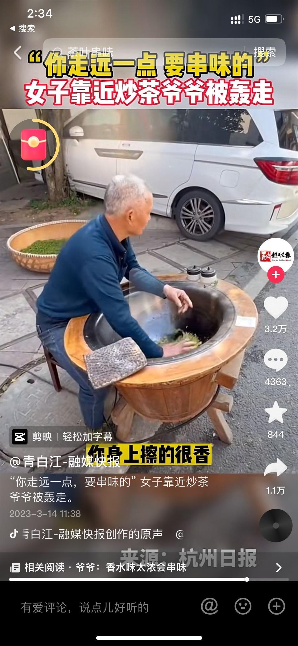 据“青白江-融媒快报”3月14日报道,3月13日,浙江杭州,一位白发爷爷正在路边炒茶,一名女子靠近后感叹:“好香呀。”不料,这位炒茶爷爷回应:“你走远一点,茶叶要串味的,你身上擦得很香,不行啊。”