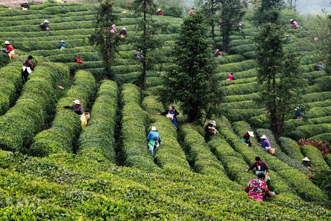 几十名茶农穿游走在茬茬新绿间,熟练地将茶尖儿放进茶篓,抢摘今年的首批春茶。