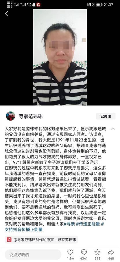 26年前,女子范玮玮在武汉街头走失,近日她回武汉寻亲,找到高度吻合的一个湖北通城家庭并见面,DNA却没有比对成功。原来,通城那个家庭的确是范玮玮走失前的家庭,但和她没有血缘关系——她是刚出生就被这家人抱养的(据极目新闻此前连续报道)。3月15日,范玮玮前往通城与养父母见面,在现场,她带着丈夫含泪跪谢养父母。