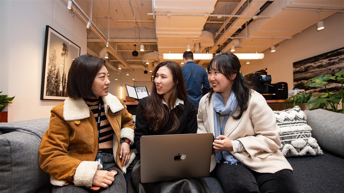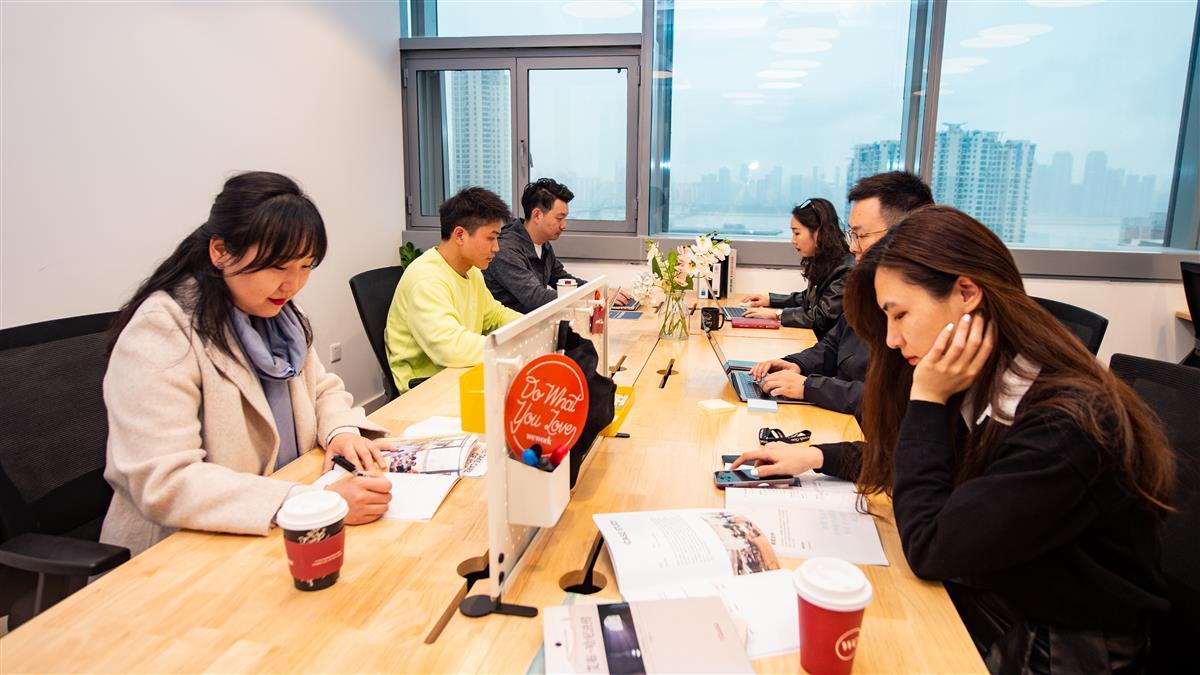 2023年3月16日,在武汉市江岸区企业天地A1写字楼里,WeWork共享办公空间里企业员工正在交流办公。在目前开放的两个楼层的共享办公空间里,已有40余家企业客户入驻,入驻率已达7成。作为一种为降低办公室租赁成本而进行共享办公空间的办公模式,受到不少中小微企业的青睐,既能能满足创业初期的低成本,又能以灵活的方式拥有自己的独立办公空间。