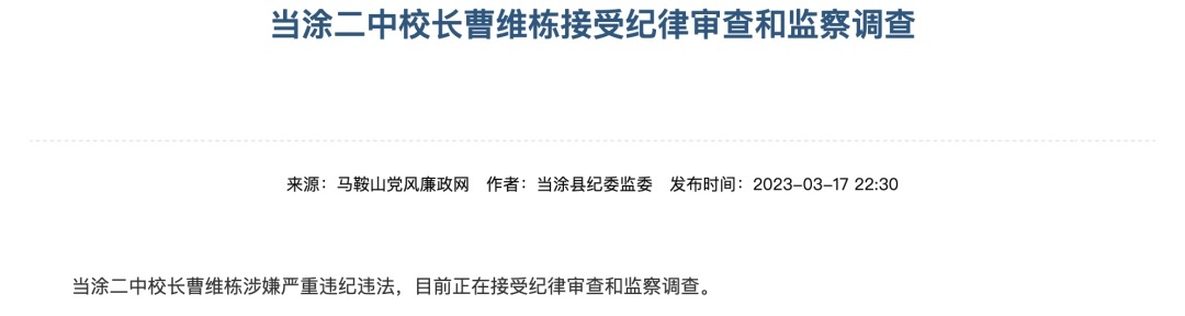 3月17日,安徽马鞍山当涂县纪委监委发布通报,当涂二中校长曹维栋涉嫌严重违纪违法,目前正在接受纪律审查和监察调查。