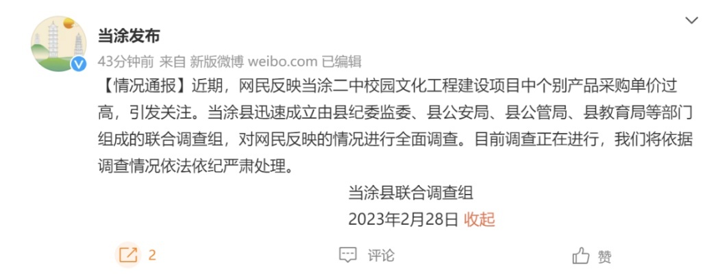 据@当涂发布,2月28日,当涂县联合调查组发布情况通报,近期,网民反映当涂二中校园文化工程建设项目中个别产品采购单价过高,引发关注。当涂县迅速成立由县纪委监委、县公安局、县公管局、县教育局等部门组成的联合调查组,对网民反映的情况进行全面调查。目前调查正在进行,我们将依据调查情况依法依纪严肃处理。