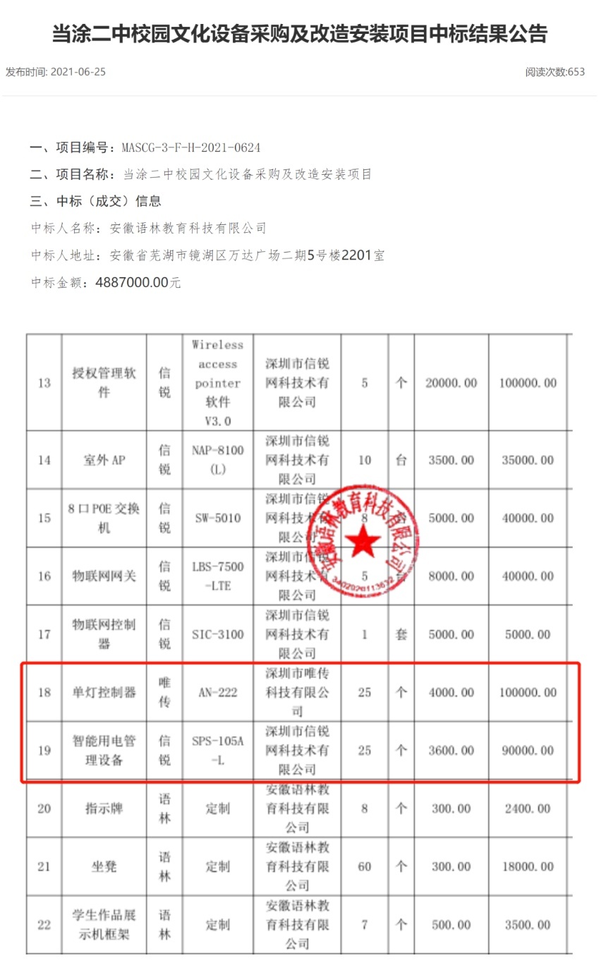 2月27日,当涂县有网友发帖称,2021年,“当涂二中一项中标金额488万元的采购项目中,出现了单价3600元的插线板和单价4000元的单灯控制器,两项总价19万元,采购疑似存在成本虚高、萝卜招标。”