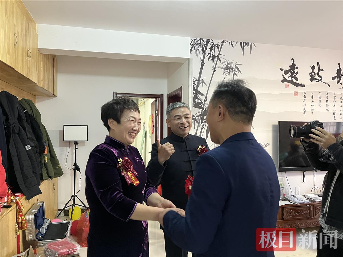 为了参加婚礼,郭刚堂特意挑选了一身黑色中式礼服,左胸前别着“父亲”字样的胸花,妻子张文革则穿着深紫色旗袍,两人面色红润,笑意盈盈。