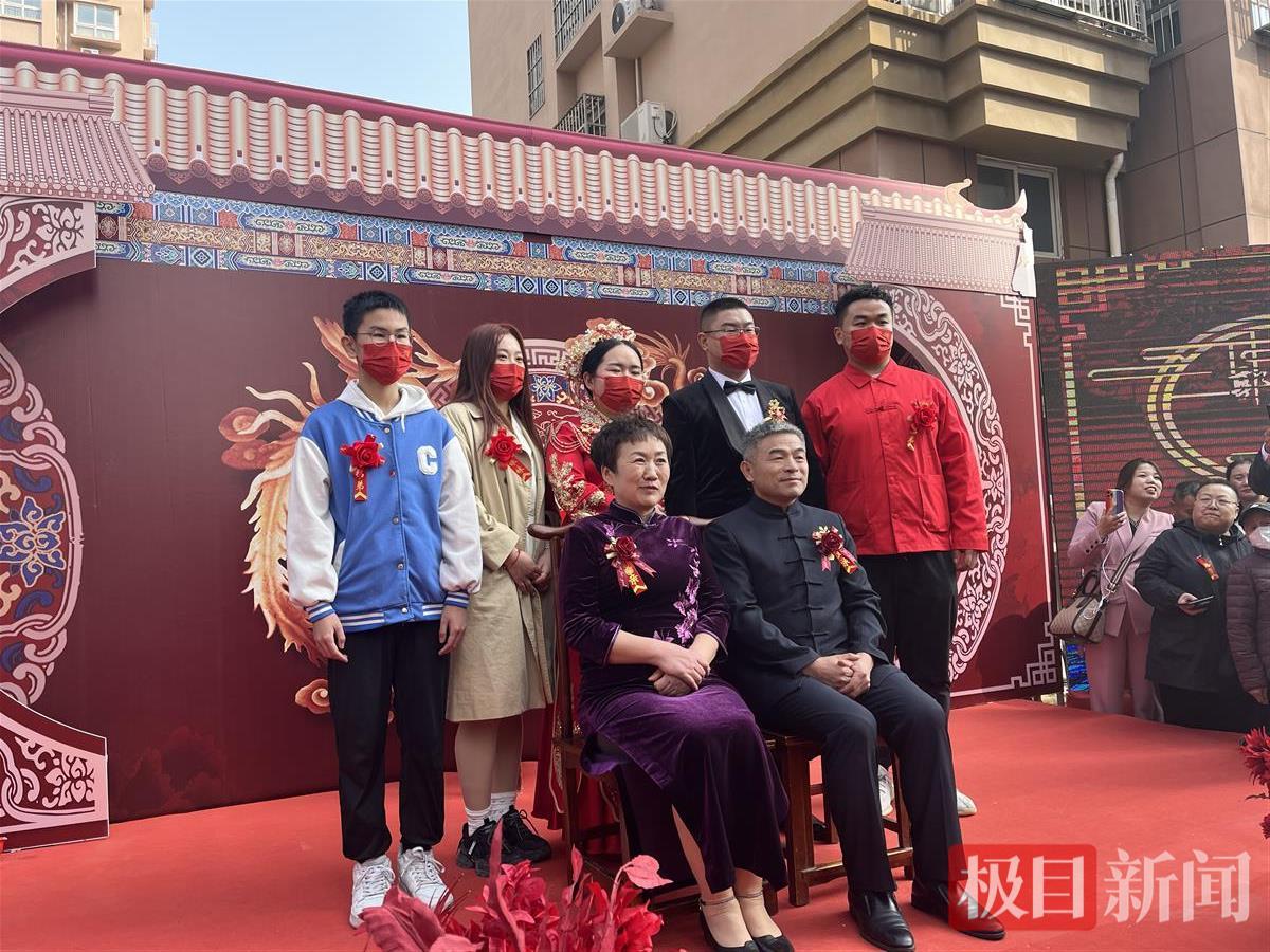 3月19日早上6时30分许,天微亮,聊城市东昌府区李太屯小区楼下的舞台旁,已聚了不少人。十几米长的红地毯铺在一处空地上,红毯尽头是一个硕大的金色喜字。居民们三三两两聚在一起,讨论着即将到来的喜事。