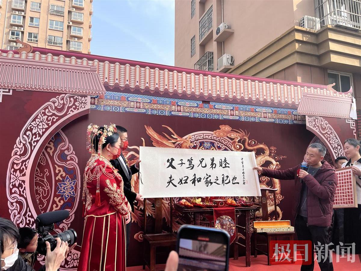 上午8时许,郭振携新娘入场,两人均佩戴着红色的口罩。郭振身材微胖,戴着一副透明款眼镜,比郭刚堂要高出半个头。一对新人分别向爷爷奶奶、爸爸妈妈敬茶行礼,新娘哽咽着大喊了三声“爸”,郭刚堂激动地大声回应“哎”,现场发出阵阵笑声。在接过儿媳的敬茶后,郭刚堂仔细品了一口,说:“二十多年,就等这杯茶了。”