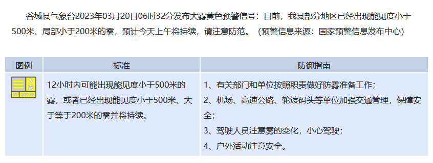 湖北省谷城县发布大雾黄色预警