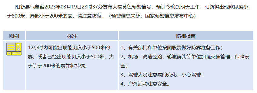 湖北省阳新县发布大雾黄色预警