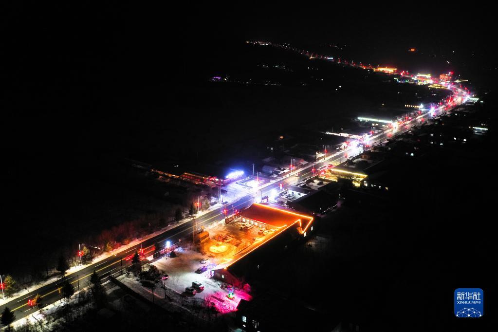2023年2月11日,夜幕下的吉林市永吉县北大湖镇南沟村灯火通明,农家乐遍布这条通往雪场的公路两边(无人机照片)。